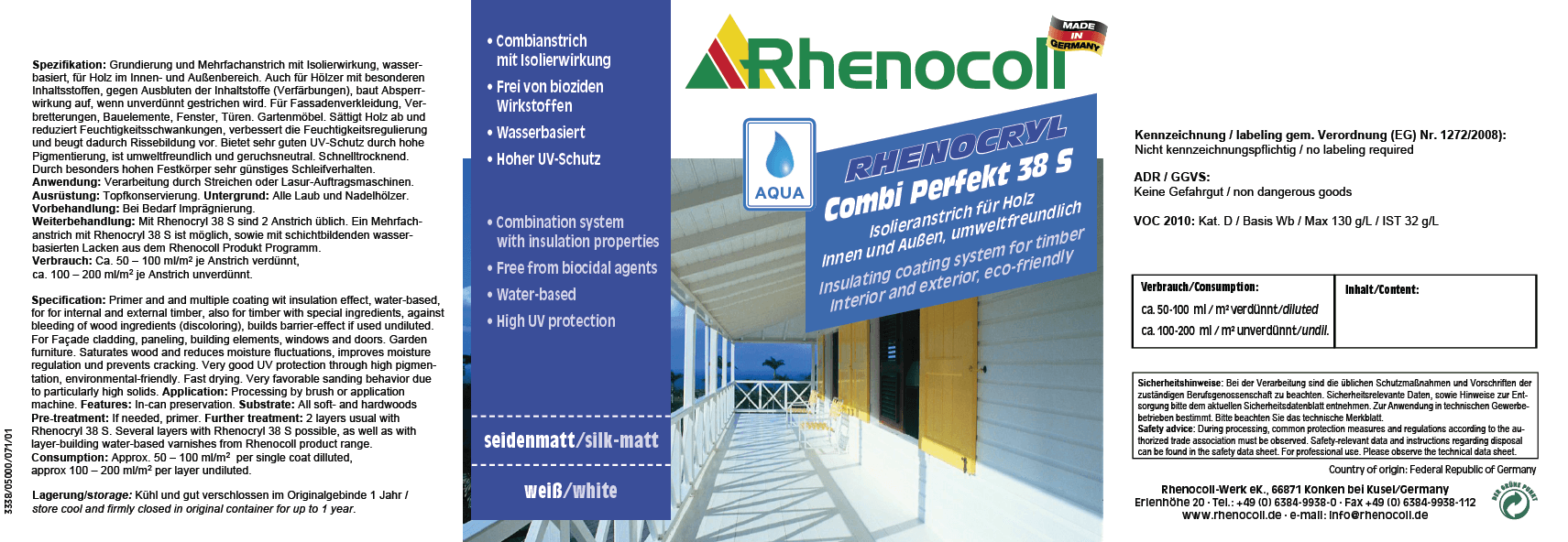 Neuanstrich: Als Grundieranstrich bei normalen Anforderungen 2-mal streichen. Kann mit Rhenocryl Decklacken endbehandelt werden. Rhenocryl 38 S Combi Perfekt kann für den Erstanstrich von unbehandelten Flächen mit bis zu 10 % Wasser verdünnt werden. Bei deckender Behandlung muss bei inhaltsstoffbelasteten Hölzern nochmals unverdünnt aufgetragen werden. Je nach Intensität der Inhaltsstoffe auch mehrmals. Dadurch soll eine Verfärbung der Oberfläche vermieden werden. Bei solchem isolierenden Aufbau, darf der Decklack erst nach 24 Stunden aufgebracht werden. Nachbehandlung soll immer erfolgen mit geeignetem Decklacksystem, wie Rhenocryl DL 90 oder Rhenocryl Deckfarbe 93.