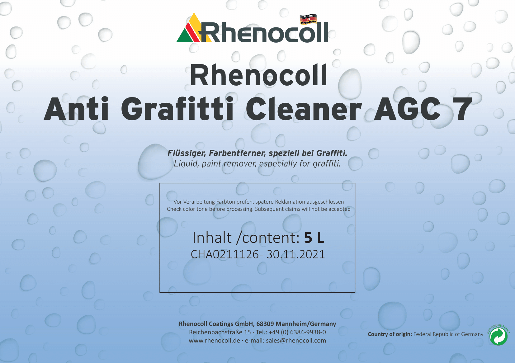 Anwendung: Rhenocoll Anti Graffiti Cleaner AGC 7 unverdünnt mit einem Pinsel, Rolle, Bürste oder Sprühflasche auftragen, vorzugsweise von oben nach unten arbeiten. Vor dem Auftrag des Graffitientferners die Fläche unterhalb des Graffitis mit Wasser satt anfeuchten.