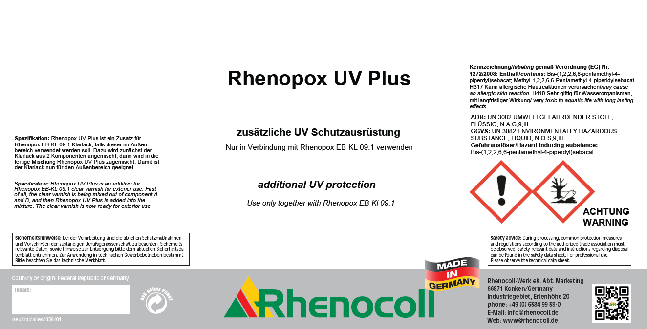 Rhenopox UV Plus ist ein Zusatz für Rhenopox EB-KL 09.1 Klarlack, falls dieser im Außenbereich verwendet werden soll. Dazu wird zunächst der Klarlack aus 2 Komponenten angemischt, dann wird in die fertige Mischung Rhenopox UV Plus zugemischt. Damit ist der Klarlack nun für den Außenbereich geeignet.