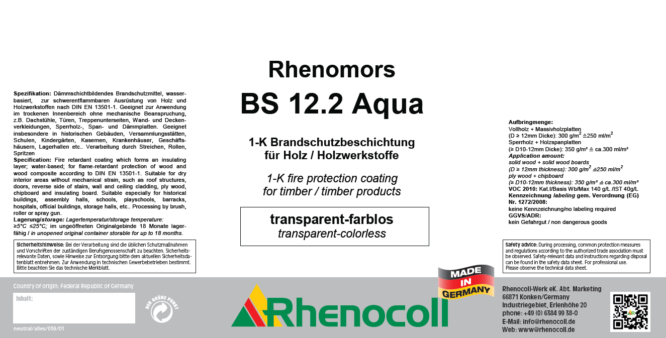 Anwendungsgebiete: Holzoberflächen im Innenbereich, wie z.B. Dachstühle, Türen, Treppen-unterseiten, Wand-und Deckenverkleidungen, Sperrholz-, Span-und Dämmplatten. Geeignet insbesondere in historischen Gebäuden, Versammlungsstätten, Schulen, Kindergärten, Kasernen, Krankenhäuser, Geschäftshäusern, Lagerhallen etc. Rhenomors BS 12.2 Aqua hat sich auf den Holzarten Fichte, Kiefer, Tanne, Eiche und Buche bewährt. Bei allen anderen Holzarten bitte anwendungstechnischen Rat einholen. Insbesondere auf dunklen Hölzern sollte vor Verarbeitung eine Probefläche angelegt werden.