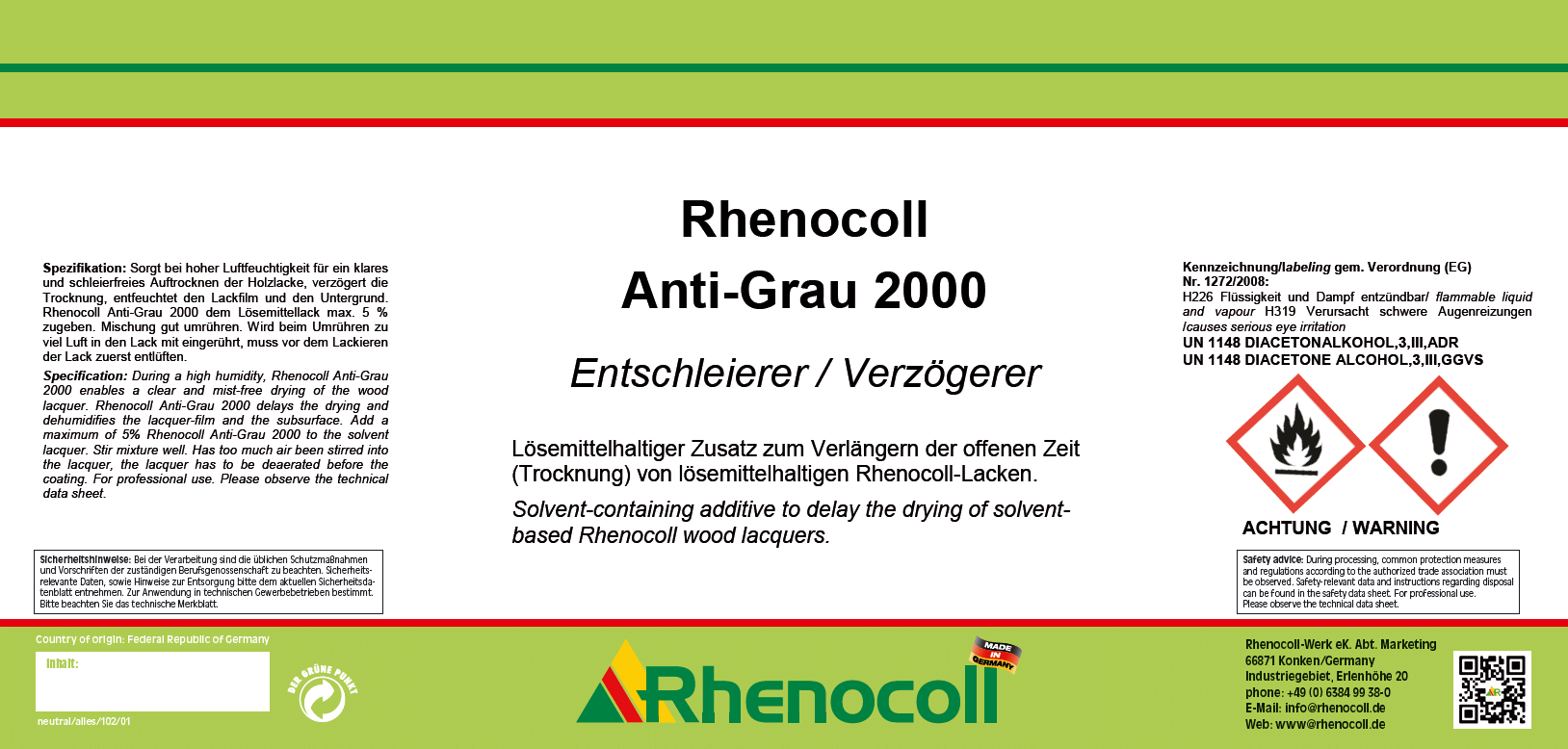 Rhenocoll Anti-Grau 2000 dem Lösemittellack max. 5 % zugeben. Mischung gut umrühren. Wird beim umrühren zuviel Luft in den Lack mit eingerührt, muss vorm lackieren der Lack zu erst entlüften.
