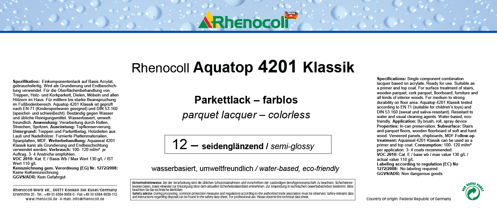 Spezifikation: Einkomponentenlack auf Basis Acrylat, gebrauchsfertig. Wird als Grundierung und Endbeschichtung verwendet. Für die Oberflächenbehandlung von Treppen, Holz- und Korkparkett, Dielen, Möbeln und allen Hölzern im Haus. Für mittlere bis starke Beanspruchung im Fußbodenbereich.