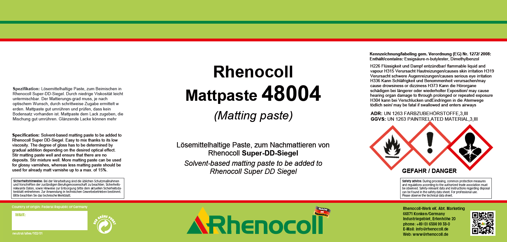 Pasten zum Nachmattieren von lösemittelhaltigen Rhenocoll-Lacken. Verwendung wie oben genannt. Die Pasten können immer nur für die vorgesehenen Lacke eingesetzt werden.