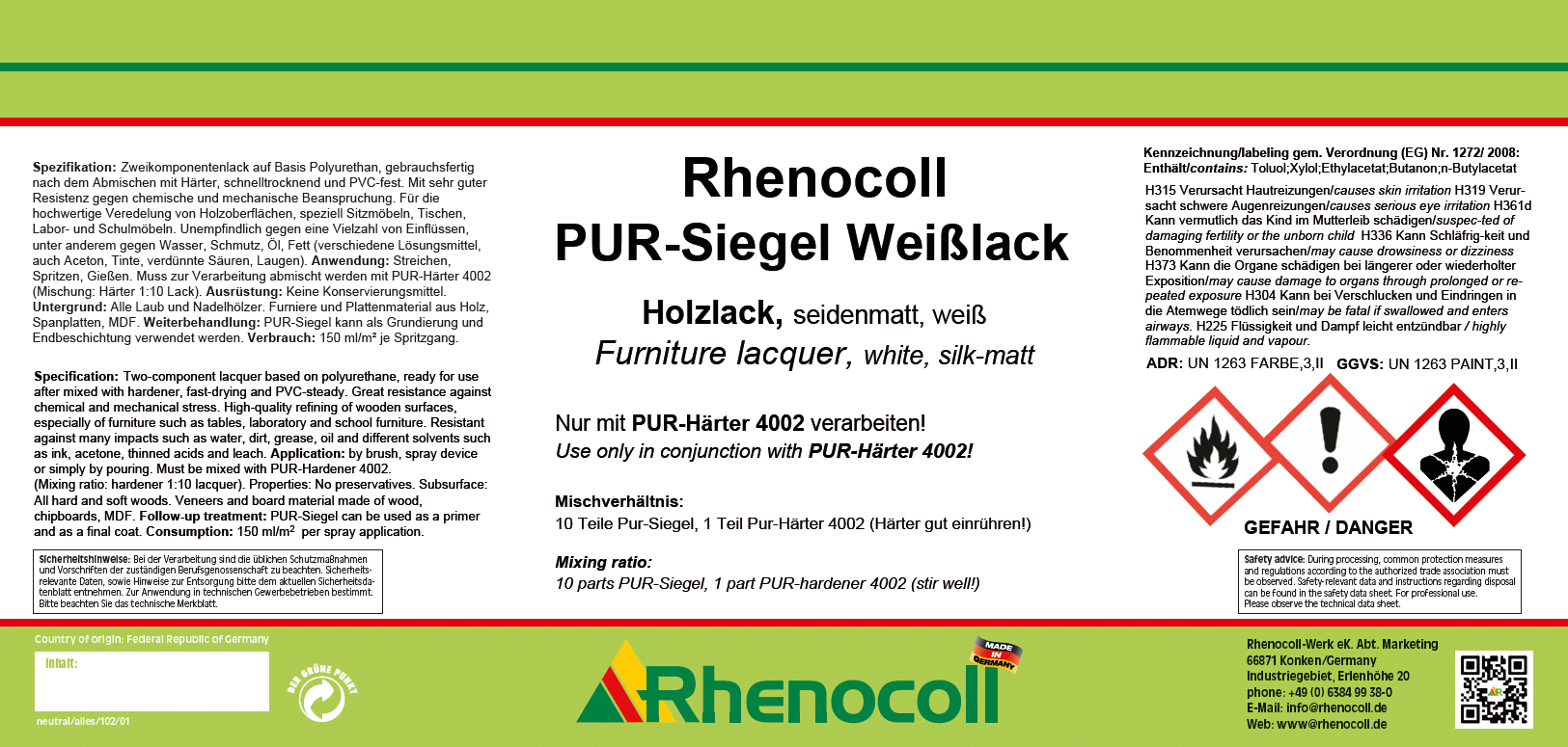 Spezifikation: Zweikomponentenlack auf Basis Polyurethan, gebrauchsfertig nach dem Abmischen mit Härter, schnelltrocknend und PVC-fest. Mit sehr guter Resistenz gegen chemische und mechanische Beanspruchung. Für die hochwertige Veredelung von Holzoberflächen, speziell Sitzmöbeln, Tischen, Labor- und Schulmöbeln. Unempfindlich gegen eine Vielzahl von Einflüssen, unter anderem gegen Wasser, Schmutz, Öl, Fett (verschiedene Lösungsmittel, auch Aceton, Tinte, verdünnte Säuren, Laugen).