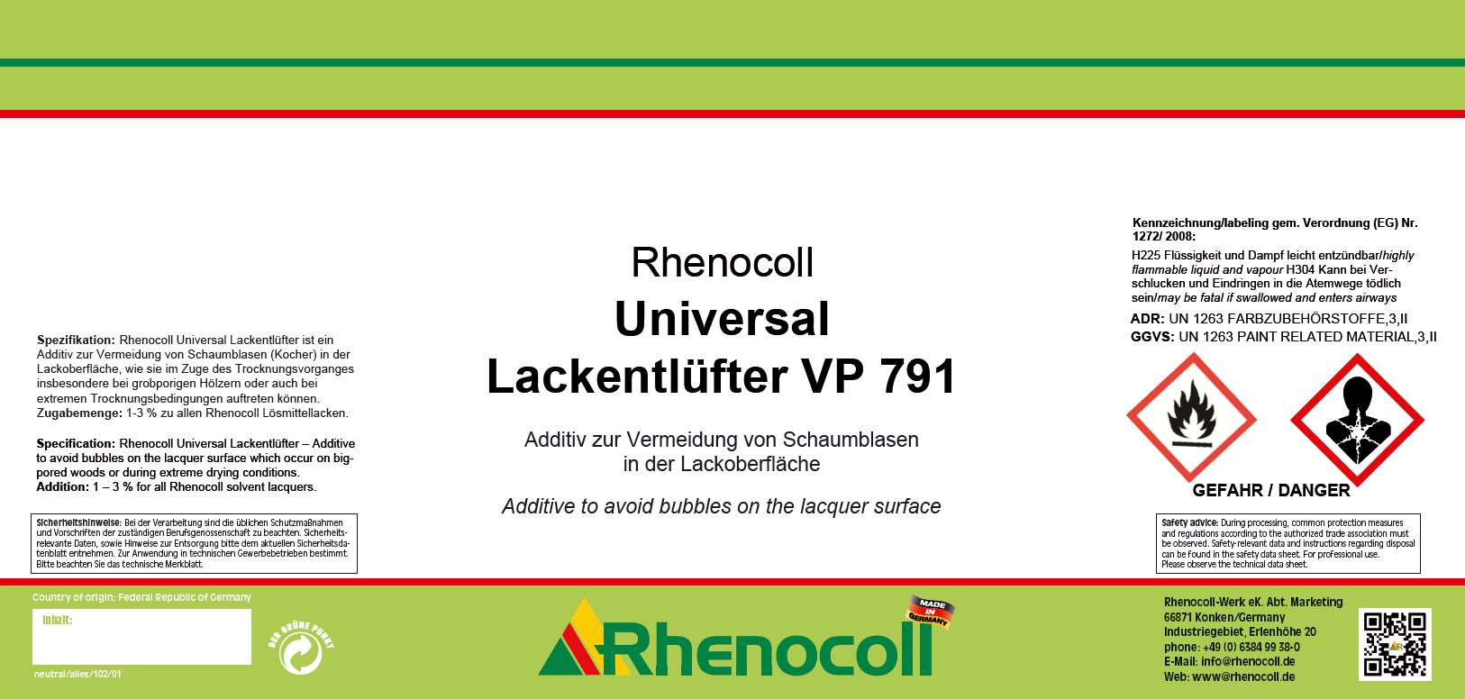 Rhenocoll Universal Lackentlüfter ist ein Additiv zur Vermeidung von Schaumblasen (Kocher) in der Lackoberfläche, wie sie im Zuge des Trocknungsvorganges insbesondere bei grobporigen Hölzern oder auch bei extremen Trocknungsbedingungen auftreten können. Zugabemenge 1-3 % zu allen Rhenocoll Lösmittellacken.