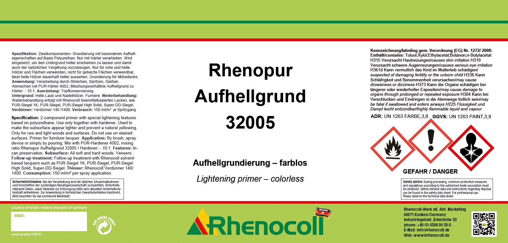 Spezifikation: Zweikomponenten- Grundierung mit besonderen Aufhelleigenschaften auf Basis Polyurethan. Nur mit Härter verarbeiten. Wird eingesetzt, um den Untergrund heller erscheinen zu lassen und damit auch der natürlichen Vergilbung vorzubeugen. Nur für rohe und helle Hölzer und Flächen verwenden, nicht für gebeizte Flächen verwendbar, lässt helle Hölzer dauerhaft heller aussehen. Grundierung für Möbellacke.