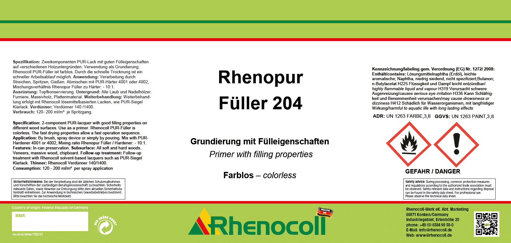 Spezifikation:Zweikomponenten PUR-Lack mit guten Fülleigenschaften auf verschiedenen Holzuntergründen. Verwendung als Grundierung. Rhenocoll PUR-Füller ist farblos. Durch schnelle Trocknung ist ein schneller Arbeitsablauf möglich.
