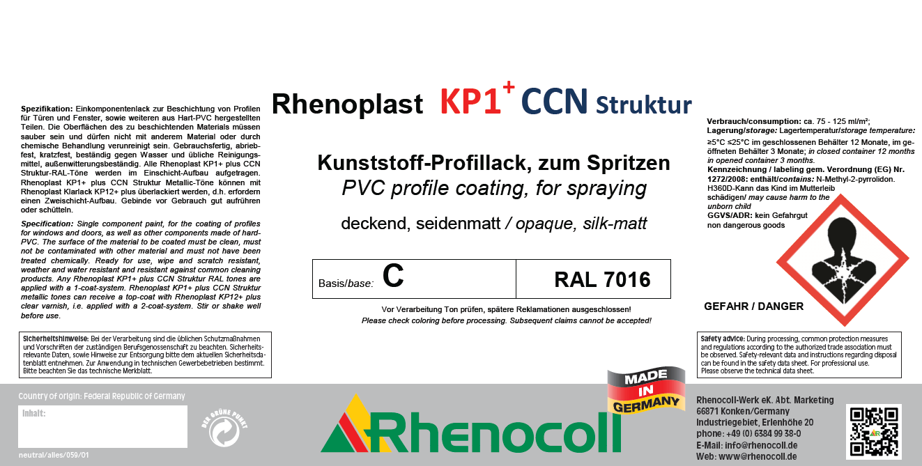 Spezifikation: Einkomponentenlack mit Struktur für die universelle Beschichtung von Hart-PVC-Profilen für Türen und Fenster, sowie weiteren aus Hart-PVC hergestellten Teile. Mit der Einstellung Easy-to-Clean und der Grundeinstellung für die Pigmentierung im hitzereflektierenden Bereich. Gebrauchsfertig, abriebfest, kratzfest, beständig gegen Wasser und übliche Reinigungsmittel, außenwitterungsbeständig. Für die Lackierung von Rahmen (liegend und hängend) und Profilen. Die Basisfarbe kann pigmentiert werden nach den Standardrezepturen, also ohne Cool Coating-Nano Effekt und mit den Rezepturen Cool Coating-Nano, nur damit wird der gesamte Effekt der Cool Coating-Nano Wirkung erreicht. Alle KP1+ plus CCN Struktur RAL-Töne können im Einschicht-Aufbau aufgetragen werden. Rhenoplast KP1+ CCN Struktur Metallic-Töne können mit Rhenoplast KP12+ überlackiert werden, d.h. erfordern einen Zweischicht-Aufbau. Die Oberflächen des zu beschichtenden Materials müssen sauber sein, dürfen nicht mit Silikon oder anderem Material verunreinigt sein und dürfen vorher keine chemische Behandlung erfahren haben.