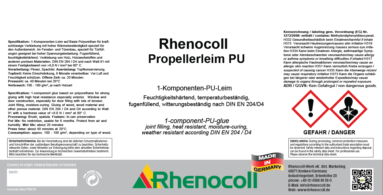 Anwendung: Rhenocoll Propellerleim PU ist ein 1-komponentiger Leim auf Basis Polyurethan nach DIN EN 204/D4. Für kraftschlüssige Verklebung mit hoher Wärmestandfestigkeit, fugenfüllend. Propellerleim PU ist feuchtigkeitshärtend.