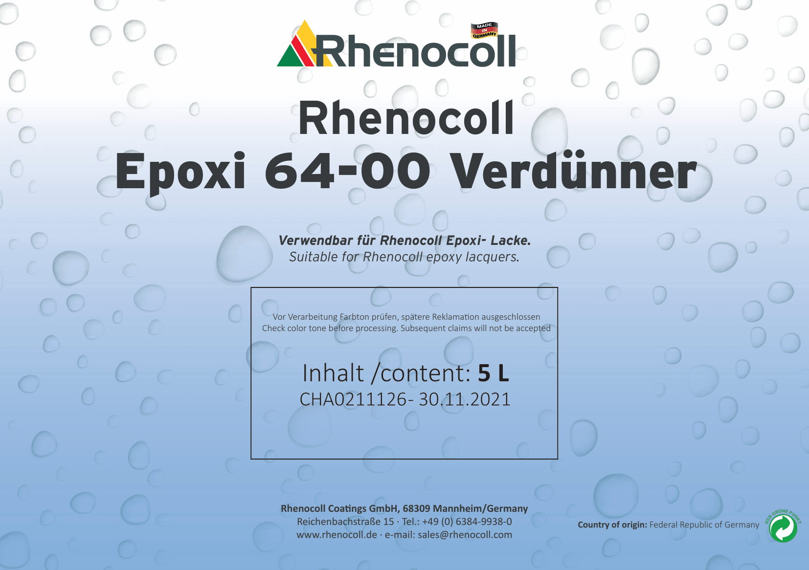 Spezifikation: Rhenocoll Rhenocoll Epoxi 64-00 Verdünner. ist verwendbar für Rhenocoll Epoxi- Lacke, wie Rhenocoll 82 S Unicoat Epoxi 2K, Rhenocoll 65 S Dickschichtgrund Epoxi 2K und Rhenocoll 64 S Haftgrund Epoxi 2K. Verdünnungsmittel, zum Ausgleich von Verdunstungsverlusten oder zum Einstellen einer Spritzviskosität. Zugabe nach Bedarf, normalerweise nicht über 5- 10%.
