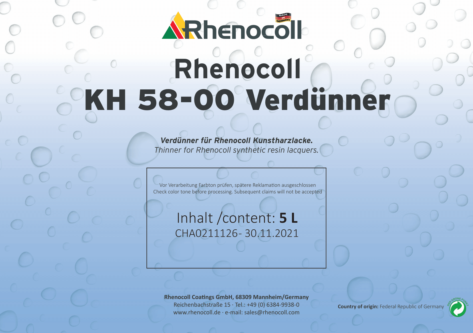 Spezifikation: Rhenocoll Rhenocoll KH 58-00 Verdünner ist verwendbar für Rhenocoll Kunstharzlacke, wie Rhenocoll 80 S Unibunt KH und Rhenocoll 58 S Metallgrund KH. Verdünnungsmittel, zum Ausgleich von Verdunstungsverlusten oder zum Einstellen einer Spritzviskosität. Zugabe nach Bedarf, normalerweise nicht über 5- 10%.