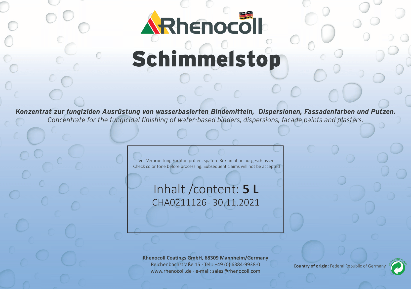 Mit dem Rhenocoll Schimmelstop können alle Innenwandfarben mit zusätzlichen Bioziden Eigenschaften versehen werden. Die so ausgestatteten Produkte werden damit nach der Applikation wirksam gegen die Ausbildung von Schimmel und Pilze geschützt.
